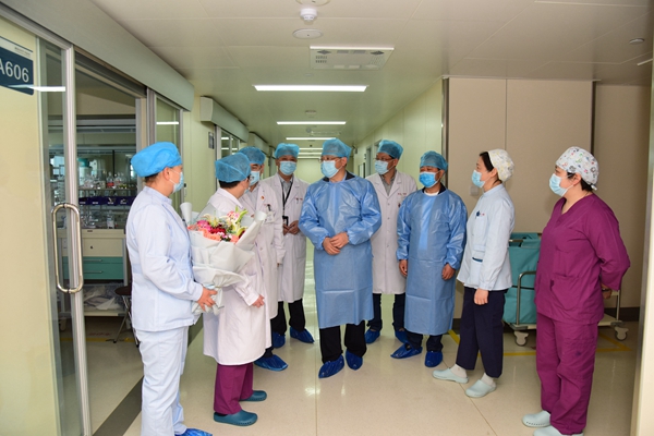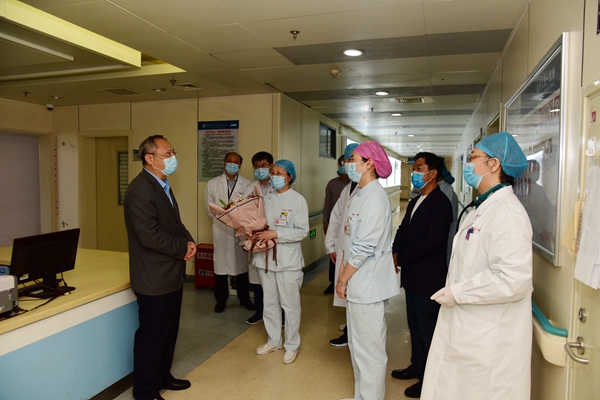 “你們辛苦了”“向大家表示感謝”“保護(hù)好自己,照顧好家人”,高書記一行分別走訪了ICU,呼吸科,感染科等臨床科室,每到一處,領(lǐng)導(dǎo)們與一線崗位的護(hù)士們親切握手,并送上鮮花和節(jié)日的祝愿與問候。