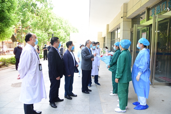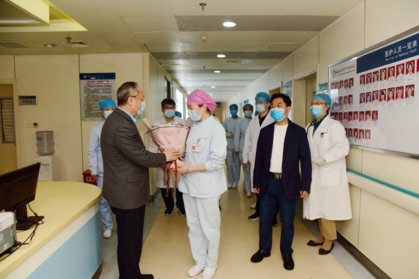 在5.12國際護(hù)士節(jié)來臨之際,5月12日上午,學(xué)校黨委書記高懷荃、校黨委副書記王俊和一行深入我院臨床一線,為護(hù)理人員送鮮花并送上節(jié)日的問候,同時表達(dá)最崇高的敬意。我院黨委書記金世洋、院長王洪巨、副院長高涌、副書記何先弟及有關(guān)職能部門負(fù)責(zé)人陪同走訪慰問。