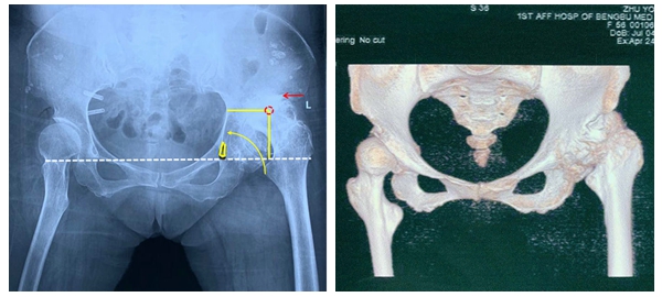 周建生教授接診后第一時間詳細詢問病史、體格檢查(圖一),結合患者術前骨盆平片,髖關節(jié)CT(圖二、圖三)平掃三維重建,診斷為:“左側髖關節(jié)發(fā)育不良(DDH Crowe III型)繼發(fā)終末期骨關節(jié)炎”。向患者建議應用我院自主研發(fā)的”個性化一體化定制髖臼假體”實現(xiàn)DDH精準全髖關節(jié)置換”的治療方案。
