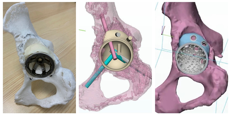 該系列研究首次報道DDH髖臼的病理形態(tài)學分型和Harris窩病理形態(tài)學分型;首次提出DDH髖臼缺損的定量測量方法,并與工程技術人員合作研發(fā)出了髖臼中心定位器;首次提出在DDH全髖置換手術中復原Harris窩,根據(jù)復原的Harris窩確定髖臼原始中心,以該中心為解剖學標志重建髖臼結構這一核心技術,實現(xiàn)了在復雜的高脫位DDH全髖置換手術中精準重建髖關節(jié)解剖結構。目前,在上述研究的基礎上,以周建生教授、官建中教授為核心的骨科研發(fā)團隊又首次將這一核心技術運用到3D打印DDH個體化定制髖臼假體的研發(fā)過程中,初步的臨床研究結果顯示,根據(jù)Harris窩定位髖臼中心,以這一解剖標志重建髖臼解剖結構及其缺損形態(tài)定制的個性化一體化髖臼假體,可以精準重建髖關節(jié)解剖結構。