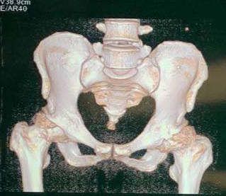 李寬新主任接診后詳細(xì)詢(xún)問(wèn)病史、體格檢查(圖一),結(jié)合患者術(shù)前骨盆平片,骨盆CT(圖二、三)平掃三維重建,診斷為:“雙側(cè)股骨頭壞死繼發(fā)終末期骨關(guān)節(jié)炎(Ficat IV期)”。為實(shí)行快速康復(fù),精準(zhǔn)解剖重建髖關(guān)節(jié),提出應(yīng)用微創(chuàng)OCM入路聯(lián)合Harris窩技術(shù),實(shí)現(xiàn)微創(chuàng)和精準(zhǔn)全髖關(guān)節(jié)置換的治療方案。