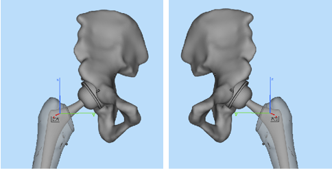 針對(duì)周先生的情況,李寬新主任、張衡博士在手術(shù)前進(jìn)行了詳細(xì)完備的術(shù)前設(shè)計(jì)(圖四),并在3Dbody、Mimics、Magic軟件上進(jìn)行入路設(shè)計(jì)和模擬手術(shù)(圖五、六),計(jì)算出髖臼杯和股骨柄大小及髖臼杯外展角、前傾角、旋轉(zhuǎn)中心位置等關(guān)鍵指標(biāo)。6月16日在周建生教授的指導(dǎo)支持下,由李寬新主任、張衡博士在我院成功應(yīng)用微創(chuàng)OCM入路聯(lián)合Harris窩技術(shù)為患者實(shí)施一期雙側(cè)人工全髖關(guān)節(jié)置換術(shù)。手術(shù)切口僅7cm,術(shù)中出血量約80ml。(圖七)