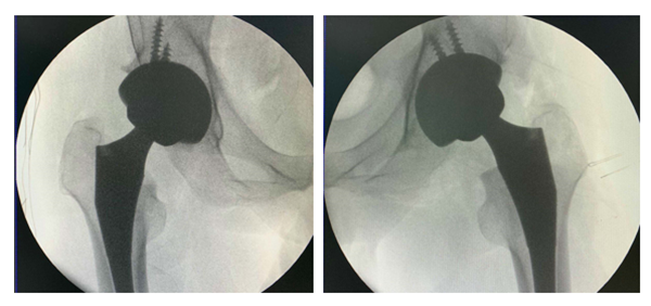 術(shù)中髖關(guān)節(jié)X線示:髖臼假體旋轉(zhuǎn)中心、前傾角、外展角良好,實(shí)現(xiàn)了精準(zhǔn)置換(圖八),患者目前恢復(fù)良好(圖九)。