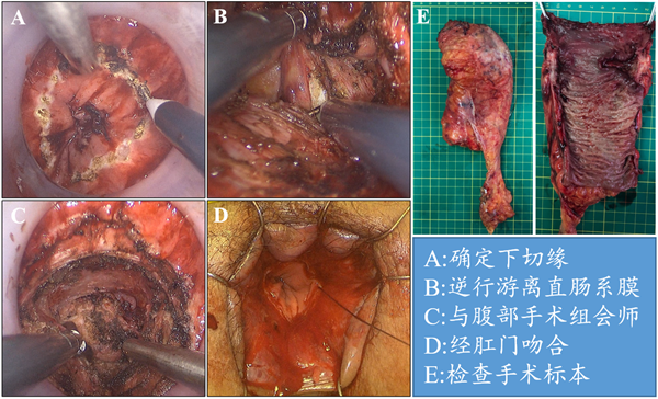 taTME手術(shù)需要腹部手術(shù)組和經(jīng)肛手術(shù)組協(xié)同完成。簡述為:腹部手術(shù)組通過傳統(tǒng)腹腔鏡游離直腸及系膜至盆底;經(jīng)肛手術(shù)組通過肛門牽開器、單孔腹腔鏡Port于肛門處建立第二手術(shù)野,直視下確定腫瘤下切緣并離斷直腸,采用“自下向上”法逆行向盆腔游離并與腹部手術(shù)組匯合,自肛門取出標(biāo)本,并根據(jù)直腸斷端長度行“直腸殘端-乙狀結(jié)腸”或“肛管-乙狀結(jié)腸”吻合。該項(xiàng)超低位保肛技術(shù)目前在國內(nèi)只有少數(shù)單位能夠開展。該技術(shù)最大優(yōu)勢能夠直視下確定腫瘤下緣位置,保證切緣無腫瘤殘留。在經(jīng)充分的手術(shù)方案設(shè)計(jì)、手術(shù)器具改造,在手術(shù)團(tuán)隊(duì)默契配合及麻醉、護(hù)理團(tuán)隊(duì)大力支持下,手術(shù)開展順利(手術(shù)過程見附圖)?;颊咝g(shù)后恢復(fù)順利,術(shù)后8天出院,肛門控便功能良好,患者及家屬對治療效果十分滿意,該例手術(shù)在皖北地區(qū)尚屬首次開展。