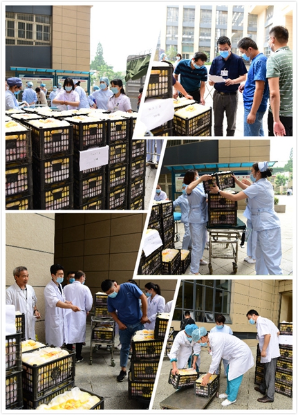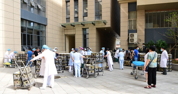 7月20日清晨,當(dāng)一抹久違的陽光灑向大地時,蚌醫(yī)一附院九號樓下已是一派熱鬧景象。一輛輛大貨車滿載著愛心消費扶貧物資運抵醫(yī)院,職工們分批領(lǐng)取著之前認購的亳州市譙城區(qū)李寨村的油桃、黃桃。