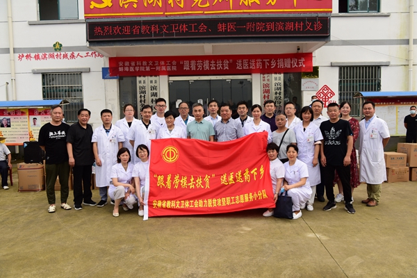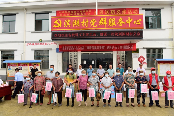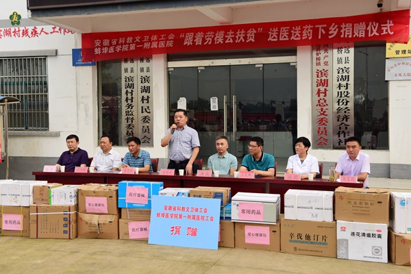 按照省總工會(huì)關(guān)于開展“跟著勞模去扶貧”活動(dòng)的部署,關(guān)愛廣大困難群眾身體健康,推進(jìn)優(yōu)質(zhì)醫(yī)療資源下基層,助力精準(zhǔn)扶貧和“百醫(yī)駐村”專項(xiàng)行動(dòng)。在省教科文衛(wèi)體工會(huì)帶領(lǐng)下,蚌埠醫(yī)學(xué)院第一附屬醫(yī)院工會(huì)組織醫(yī)院醫(yī)護(hù)專家(包括抗疫模范),攜帶常用藥品和醫(yī)療物資等,到安徽省衛(wèi)健委“百醫(yī)駐村”點(diǎn)——定遠(yuǎn)縣爐橋鎮(zhèn)濱湖村,開展“跟著勞模去扶貧”送醫(yī)送藥下鄉(xiāng)活動(dòng)。