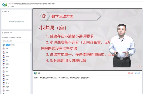 本次培訓按照安徽省衛(wèi)健委要求每批培訓時間為一周,總時間從10月14日—11月6日持續(xù)兩周,并第一次采用線上專題講座及線下工作坊相結合的方式進行。線上專題講座邀請了省內(nèi)、外知名專家:省衛(wèi)健委科教處儲新生處長、同濟大學附屬十院教育處處長、胃腸外科主任醫(yī)師余震博士、安徽省住培事務管理中心朱傳波教授、武漢大學人民醫(yī)院住培管理部門負責人盧章洪博士、浙江大學醫(yī)學院耿小北教授、重慶大坪醫(yī)院李民教授、中國科學院大學寧波華美醫(yī)院張景峰教授及我院一批從事住培帶教工作經(jīng)驗豐富的老師,講座內(nèi)容涵蓋住院醫(yī)師規(guī)范化培訓相關政策法規(guī)、專業(yè)基地內(nèi)涵建設及住培質(zhì)量提升、住院醫(yī)師規(guī)范化培訓課程體系建設、住院醫(yī)師臨床診斷思維方法培養(yǎng)、模擬教學在住培中的應用、專業(yè)基地分層遞進培訓模式設計與實踐、各類教學方法的應用等,內(nèi)容豐富,實用性強。