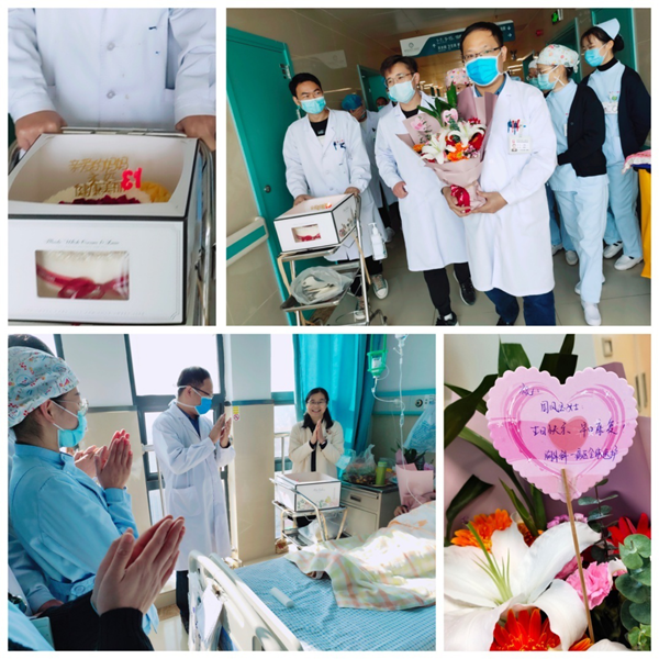在生日前一天,青年文明號的代表-護士長陳娜娜向患者家屬詳細解釋了胸外科一病區(qū)青年文明號一直以來開展的人文關懷內(nèi)容,并向家屬表達了想為患者在病房過一個特殊生日的想法?;颊呒覍賹ξ以呵嗄晡拿魈柕呐闹e非常感動。患者生日當天,科室領導和主治的醫(yī)生、護士們共同到病房送上生日蛋糕和祝福:“周奶奶生日快樂!”,“奶奶健康長壽!”當醫(yī)護人員將生日蛋糕送到周奶奶的床邊時,周奶奶臉上露出了開心的笑容,不停地說“謝謝,太感動了,謝謝大家。”在大家的生日祝福和醫(yī)護人員的陪伴下,周奶奶度過了一個溫馨、難忘的生日。