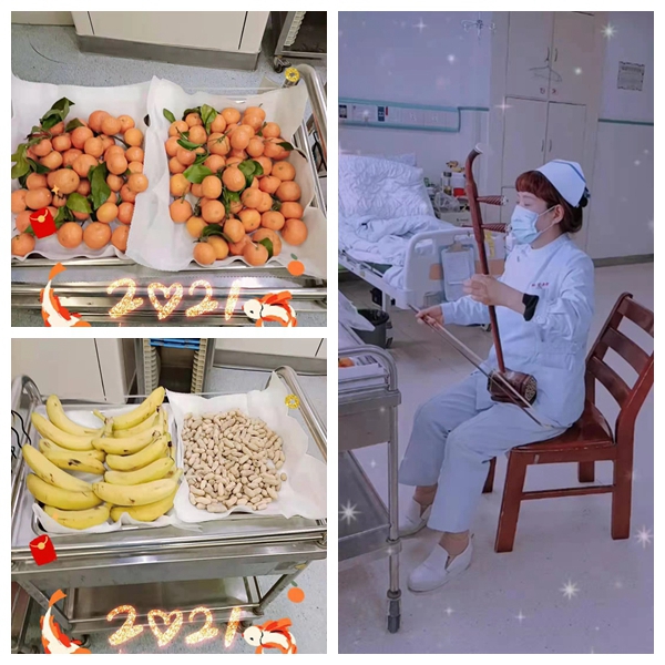 在風(fēng)濕免疫科,20多位危重病人,仍在住院治療,有吸氧的,心電監(jiān)護(hù)的,血小板減少要絕對(duì)臥床的……由于患者及家屬大都來(lái)自農(nóng)村,保留著春節(jié)聽?wèi)蚯?、下午吃雞蛋糕的風(fēng)俗習(xí)慣,醫(yī)護(hù)人員買來(lái)了水果,委托蛋糕店制作了雞蛋糕,并請(qǐng)來(lái)了食堂會(huì)唱黃梅戲的師傅董勇,唱歌、拉琴,進(jìn)行才藝表演,為患者送上文化娛樂(lè)大餐和新春祝福。