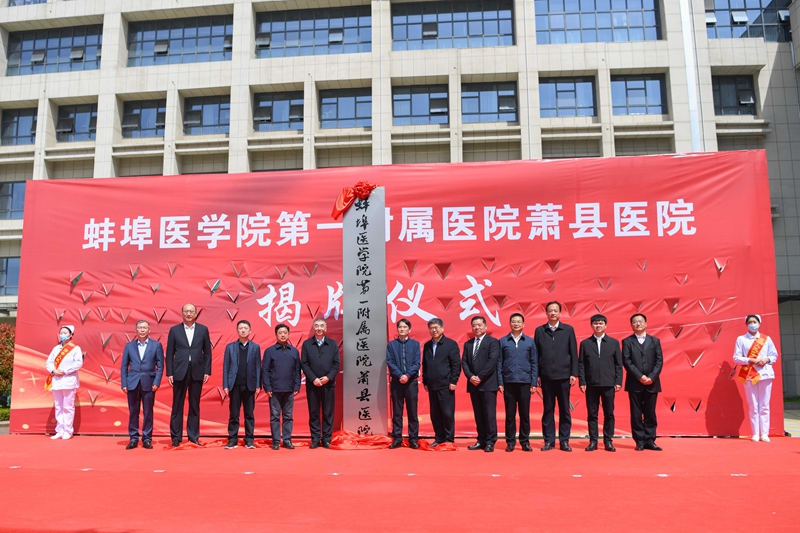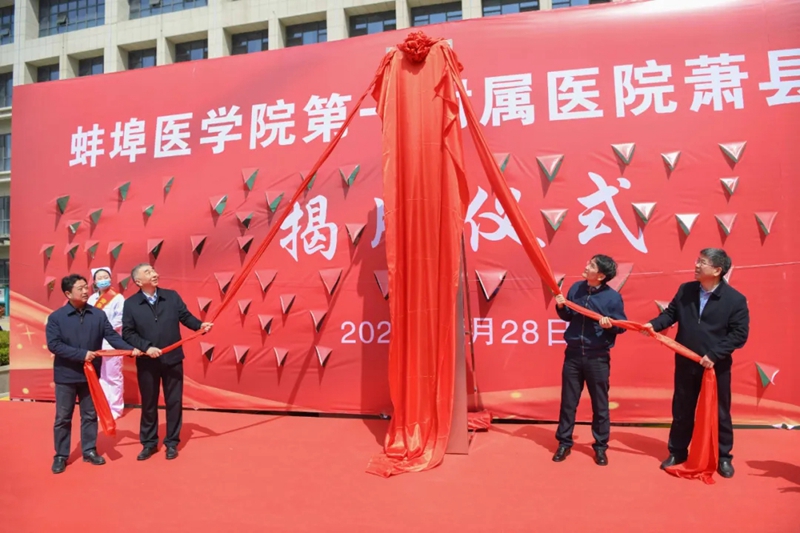 最后,省衛(wèi)健委劉同柱書記、蚌埠醫(yī)學院王俊和副書記、宿州市佘運九副市長、蚌醫(yī)一附院王洪巨院長共同為“蚌埠醫(yī)學院第一附屬醫(yī)院蕭縣醫(yī)院”揭牌。