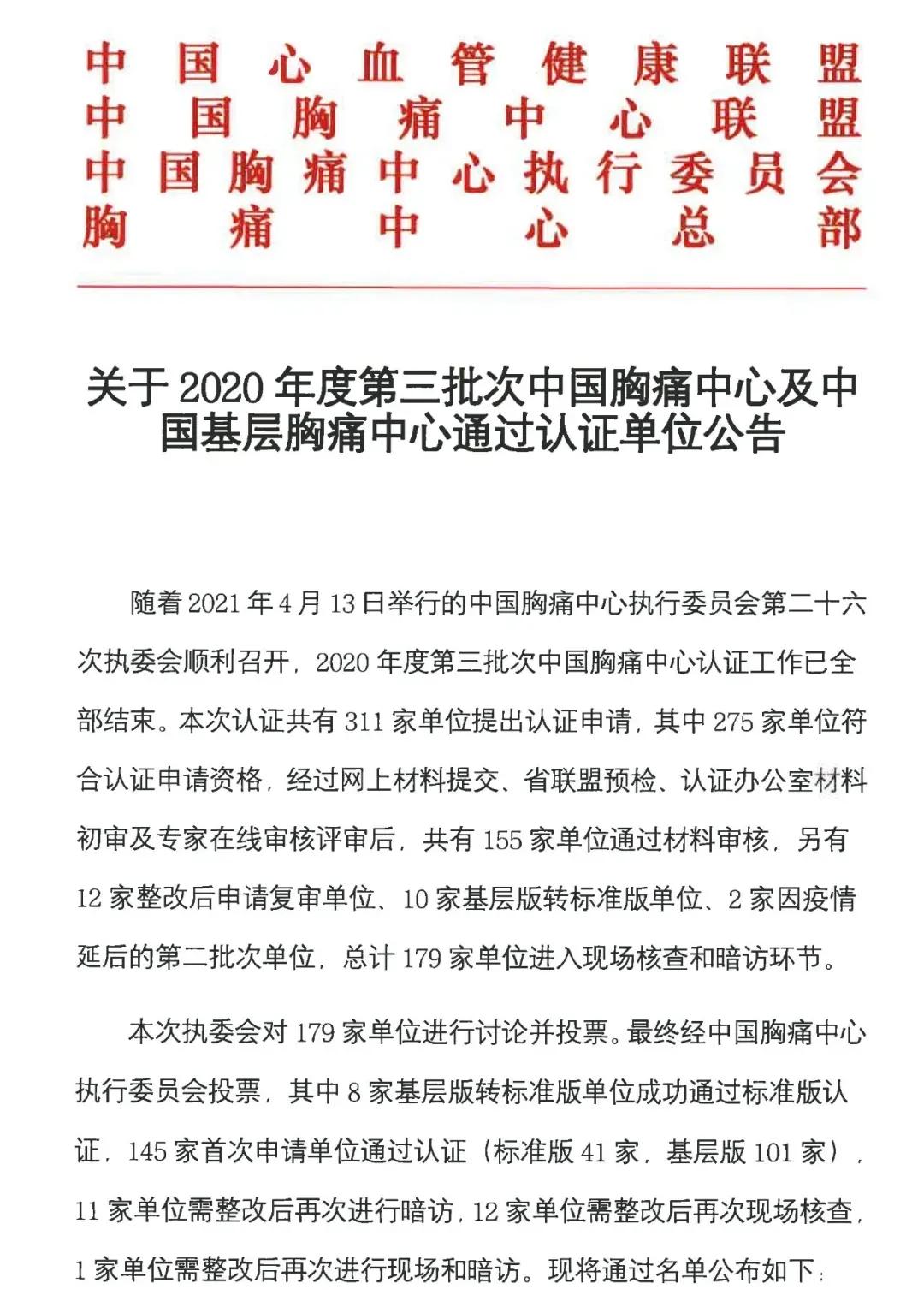 12月12日,中國胸痛中心總部發(fā)布《2020年度第三批次中國胸痛中心及基層胸痛中心通過認證單位公告》,蚌埠醫(yī)學院第一附屬醫(yī)院憑借過硬的綜合實力和救治水平順利通過2020年第三批次標準版國家級胸痛中心認證,成為蚌埠市首批通過標準版國家級胸痛中心認證單位。