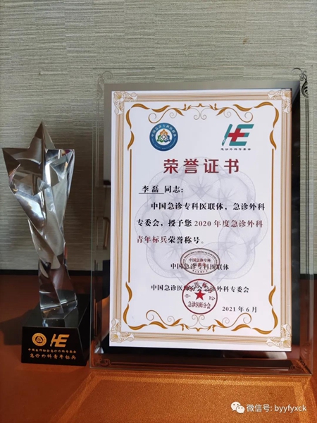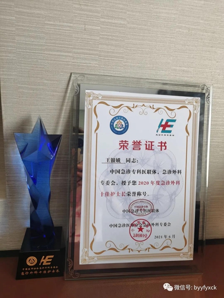 6月3-5日,中國醫(yī)師協(xié)會急診醫(yī)師分會第五屆急診外科年會在江蘇徐州召開。大會期間,為表彰全國急診外科領(lǐng)域內(nèi)樹立良好職業(yè)形象,矢志救死扶傷的優(yōu)秀醫(yī)務(wù)工作者,經(jīng)過全國范圍內(nèi)的層層甄選,我院急診外科的王銀娥護(hù)士長和李磊醫(yī)生被分別評為全國“2020年度急診外科十佳護(hù)士長”和“2020年度急診外科十佳青年標(biāo)兵”。