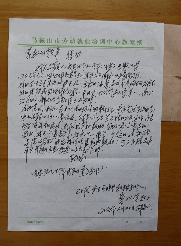 曹先生自稱是馬鞍山市的一名退休工人,今年八十歲了。2015年,曹先生因心律失常住入馬鞍山市人民醫(yī)院心血管科治療,那時(shí),他的床位分管醫(yī)生正是張先林。入院時(shí)情況非常不好,“在他的溫馨、真誠(chéng)、認(rèn)真細(xì)心的治療下,我的房顫病很快得到好轉(zhuǎn)?!辈芟壬錆M感情地寫道,“平日里,他對(duì)待病人像親人,經(jīng)他治療的人都為他高尚的醫(yī)德而稱贊!”