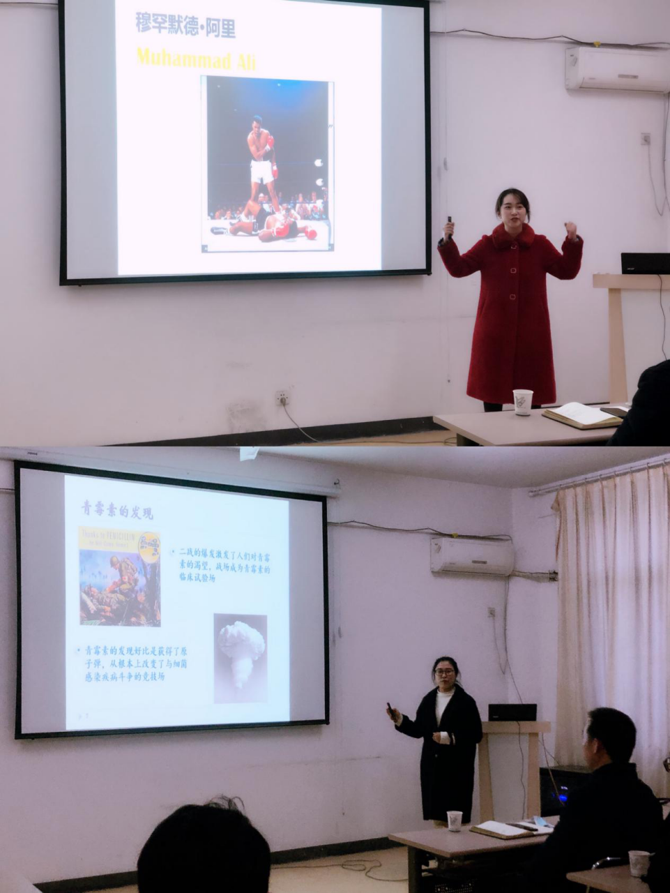 隨后,本次蚌埠醫(yī)學(xué)院青年教師教學(xué)基本功競賽一等獎獲得者姜牧君老師和三等獎獲得者朱美林老師為大家?guī)砭实氖痉督虒W(xué),內(nèi)容分別為“抗帕金森藥”和“神奇子彈”青霉素。